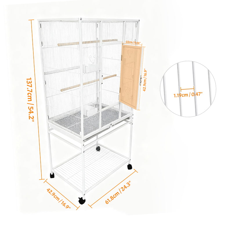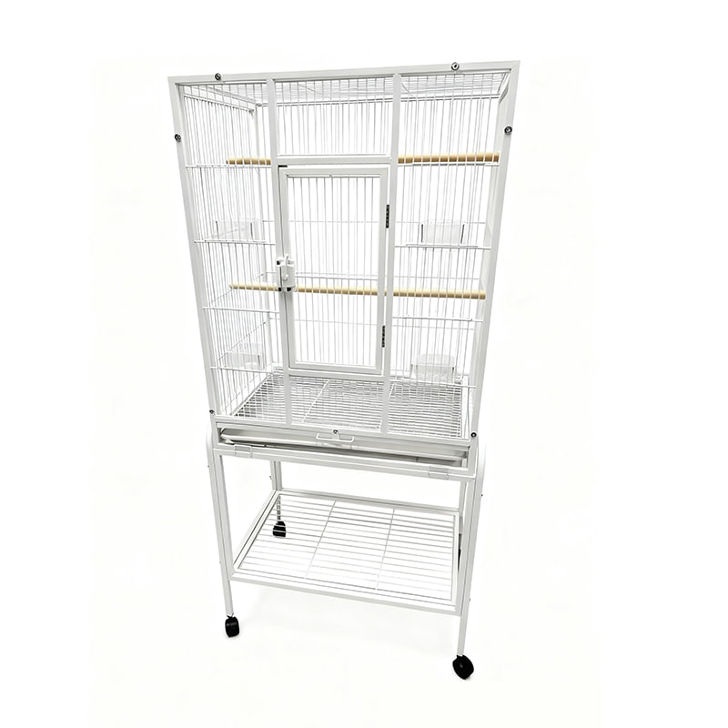 1. Spill-proof and easy-to-clean structure: The white spill-proof feeder reduces food spillage and feather loss. A pull-out tray and fixed wire mesh make it easy to quickly clean up droppings and leftovers, keeping the cage hygienic.