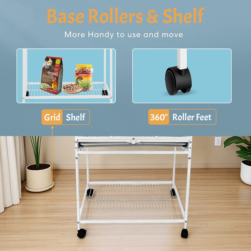 2. Enhanced safety and flexible movement: The smooth-locking system provides more precise and secure protection than traditional locks, preventing parrots from accidentally opening the cage. 360° casters and a storage rack at the bottom facilitate the movement and storage of pet supplies.