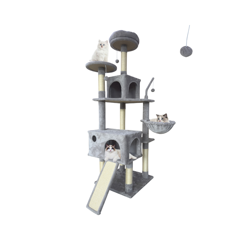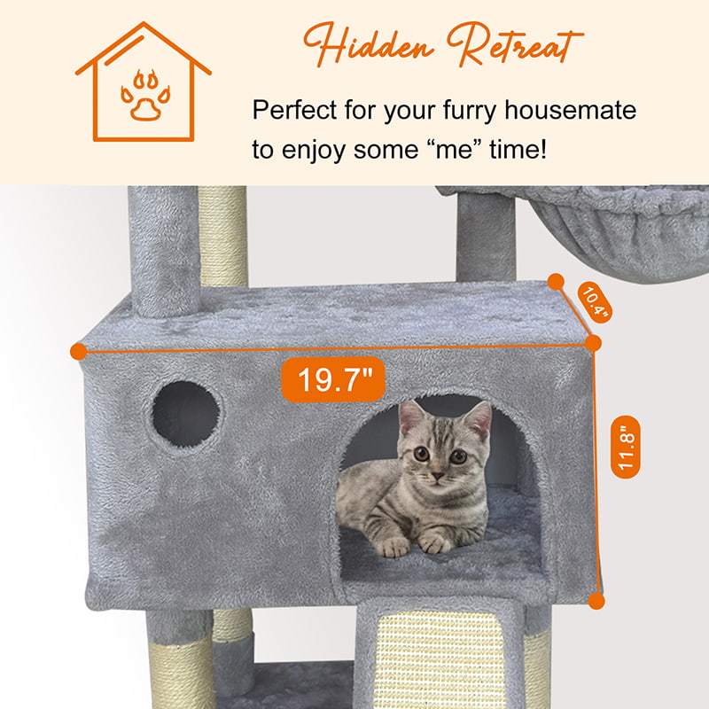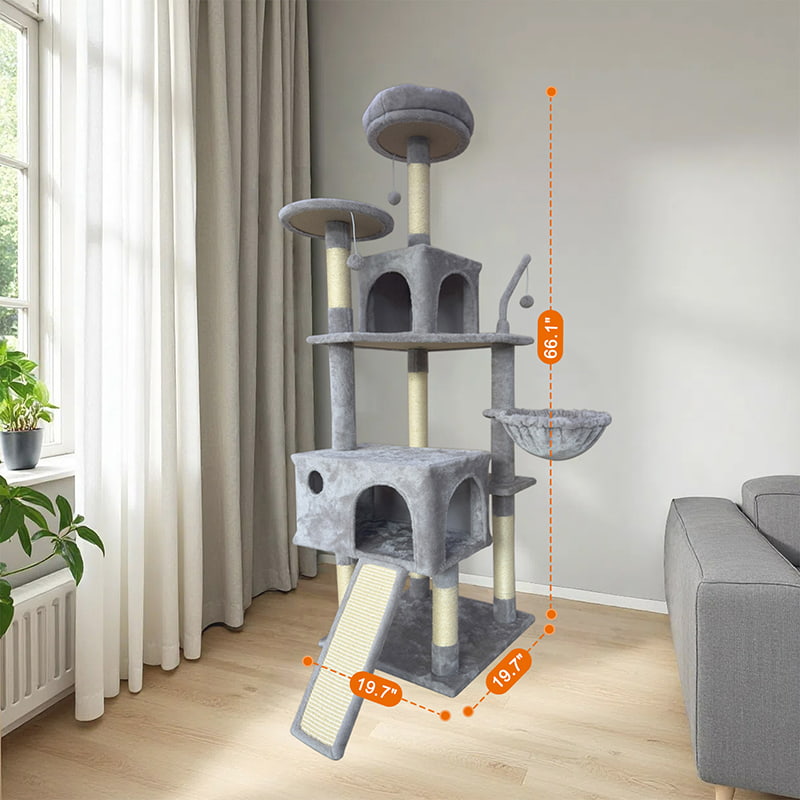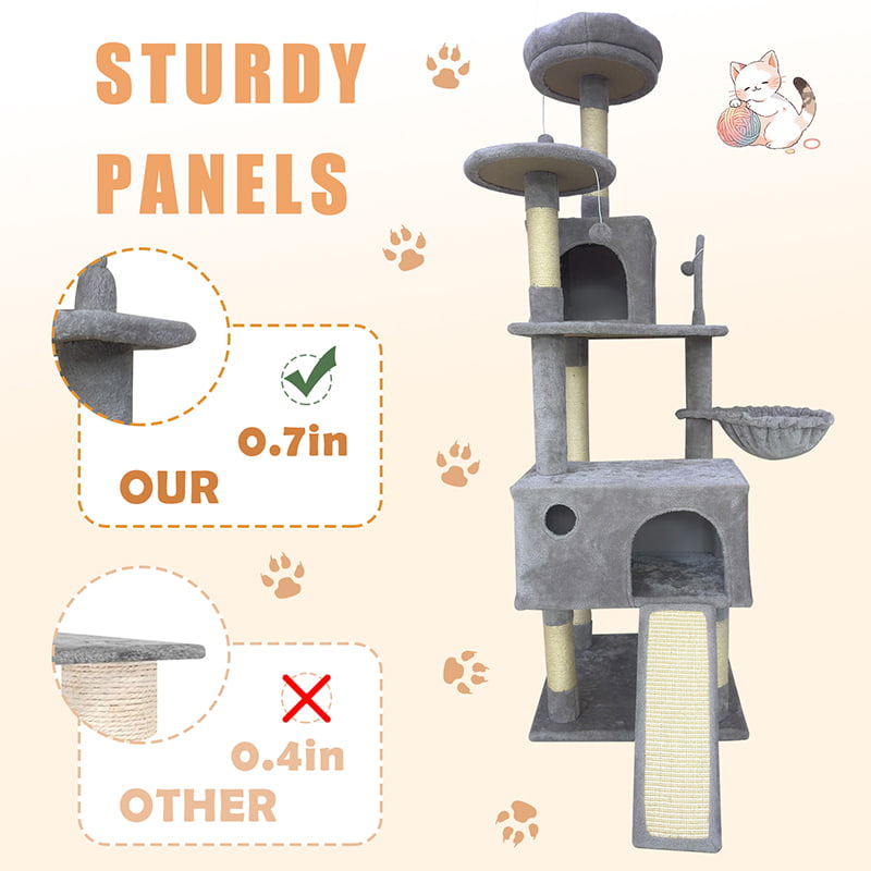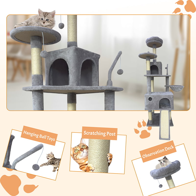 2. Comfort and Fun Combined: Equipped with two thickened, semi-enclosed plush beds, it provides soft hiding spaces for cats. Combined with a hammock, hanging pom-poms, and sisal scratching posts, it creates a multi-functional entertainment area for scratching, playing, and resting, meeting the daily behavioral needs of cats.